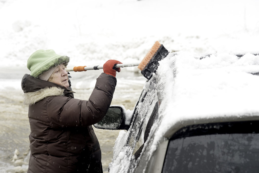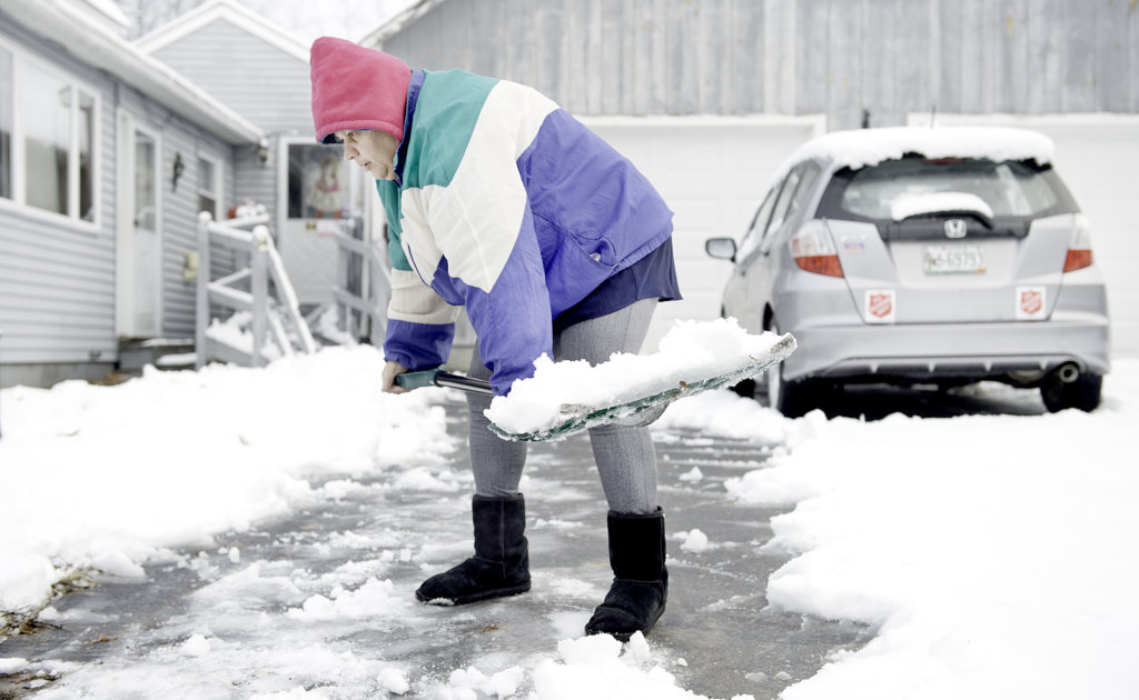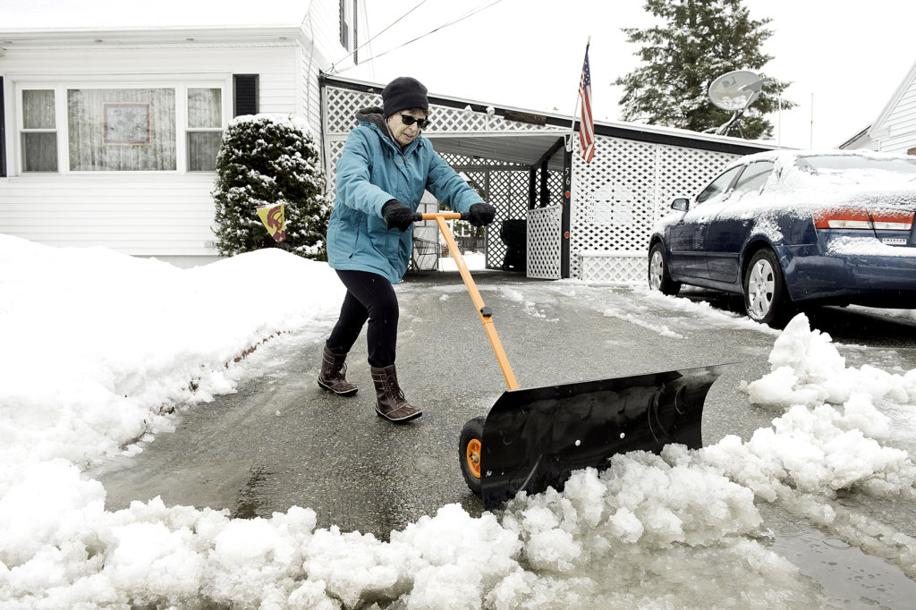 Maggie Esposito clears the snow from her Lewiston driveway on New Year’s Day. A plow driver from St. Laurent & Sons Excavation saw Esposito struggling with the wet heavy snow and made a few passes to help her. (Sun Journal photo by Daryn Slover)