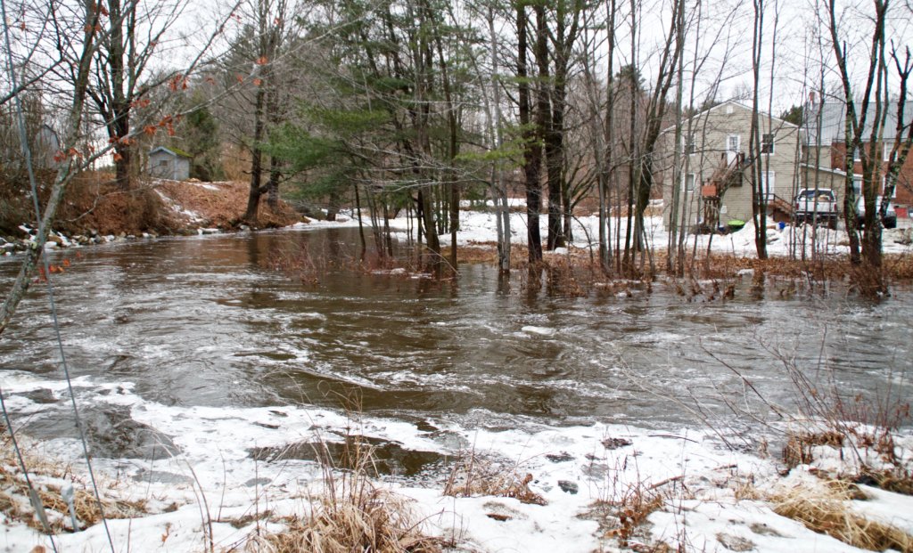 After Friday’s heavy rain and temperatures in the 50s, the Little Androscoggin River swells Saturday in South Paris, threatening to flood residences near the river’s confluence with Stony Brook — near the junction of routes 117 and 119. (Sun Journal photo by Abigail Austin)