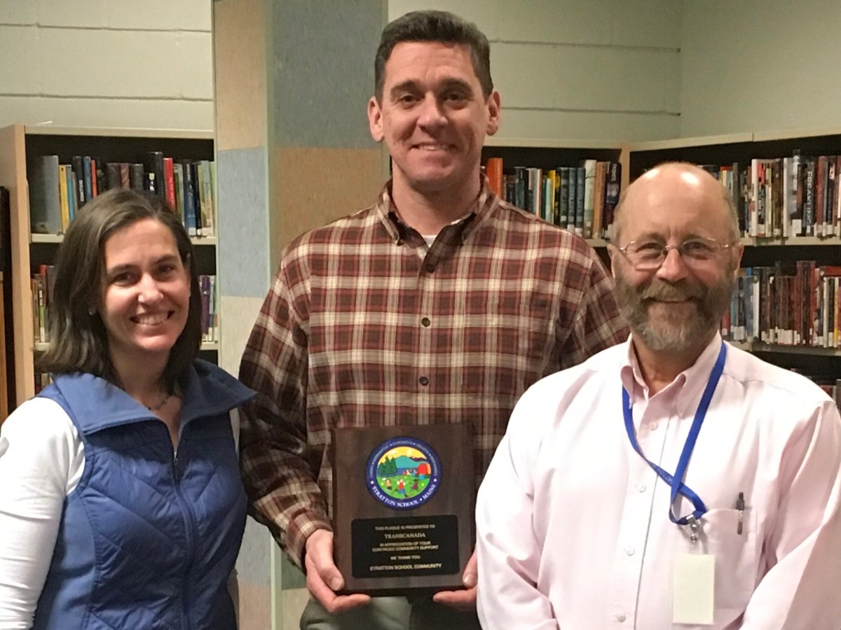 Harrison Hauser of TransCanada Corp., center, holds a plaque of appreciation presented by the Stratton school board on Feb. 14. The energy company has awarded grants to support the school’s food program and math and art curriculum. School board Chairwoman Sarah Strunk and Principal Barry O. London did the honors.