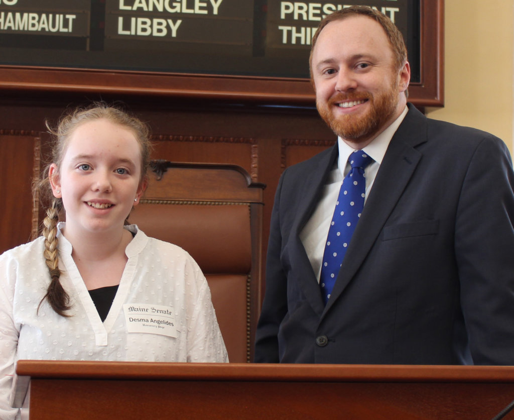 Lewiston Middle School student Desma Angelides served as an Honorary Page in the Maine Senate on Thursday, March 15. She was the guest of Sen. Nate Libby of Lewiston and is pictured with him following the Senate session.