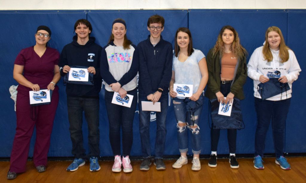 These Dirigo High School students were recognized by their teachers for outstanding work in their classes last month. From left are Gabrielle White, Bridge Year English; Damieu Nadeau, Physical Education; Devon Fletcher, AP U.S. History; Spencer Jacques, Advanced World Studies; Alexa Perreault, English 9; Elizabeth Raheb, Physics; Tori Bellegarde, Science.