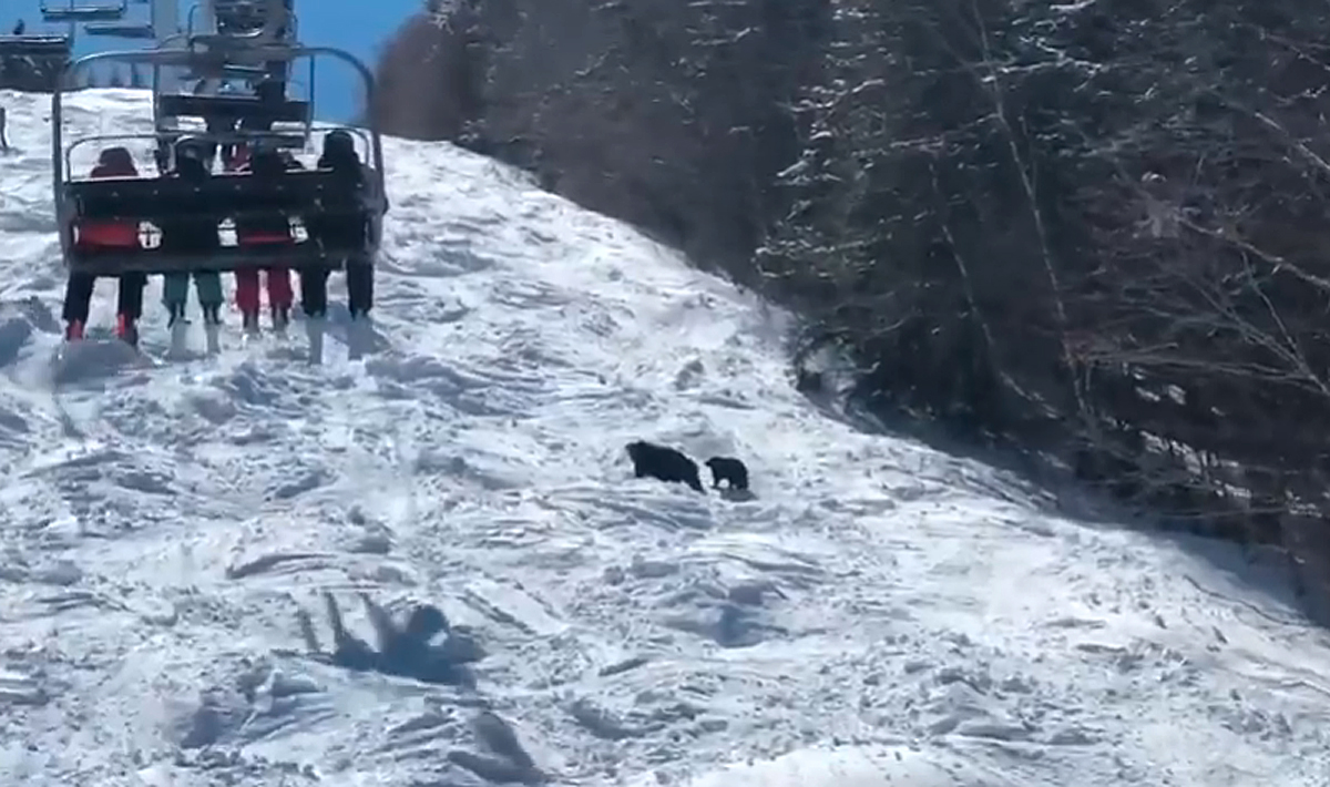 NEWRY — Sunday River skiers on a ski lift watched a black bear and her cubs wander onto a slope briefly Thursday. The trio returned to the treeline quickly. It’s unclear what they thought of the conditions.