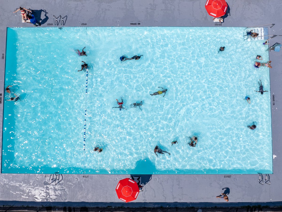 Flying over the splash pad and pool on a hot summer day at Kennedy Park in Lewiston.