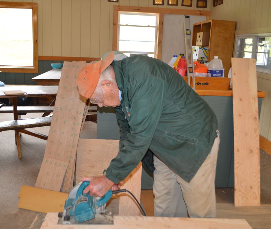 Richard Forster of Farmington, a member of the Farmington Ski Club, cuts a piece of plywood Tuesday for the kitchen remodeling project at Titcomb Mountain lodge in Farmington. Forster was inducted Saturday into the Maine Ski Hall of Fame. Donna M. Perry/Sun Journal