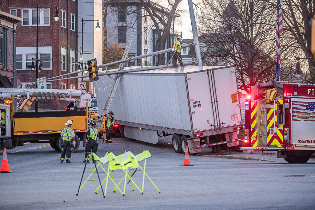A tractor-trailer truck driven by Alexsander Darizhapov, 34, went up onto the sidewalk near the courthouse in Auburn on Saturday night, hitting the traffic light. (Andree Kehn/Sun Journal) A tractor-trailer truck driven by Alexsander Darizhapov, 34, went up onto the sidewalk near the courthouse in Auburn on Saturday night, hitting the traffic light. (Andree Kehn/Sun Journal)