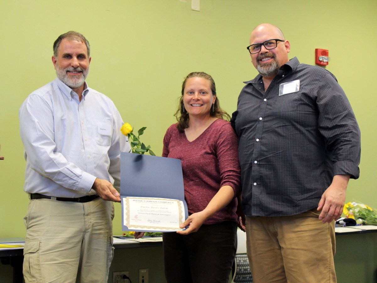 Erica Emery and Dave Allen, owners of Rustic Roots Farm received the Corporate Partner of the Year Award which recognizes an outstanding corporate partner and its staff for their exemplary partnership with a Maine Campus Compact member institution.
