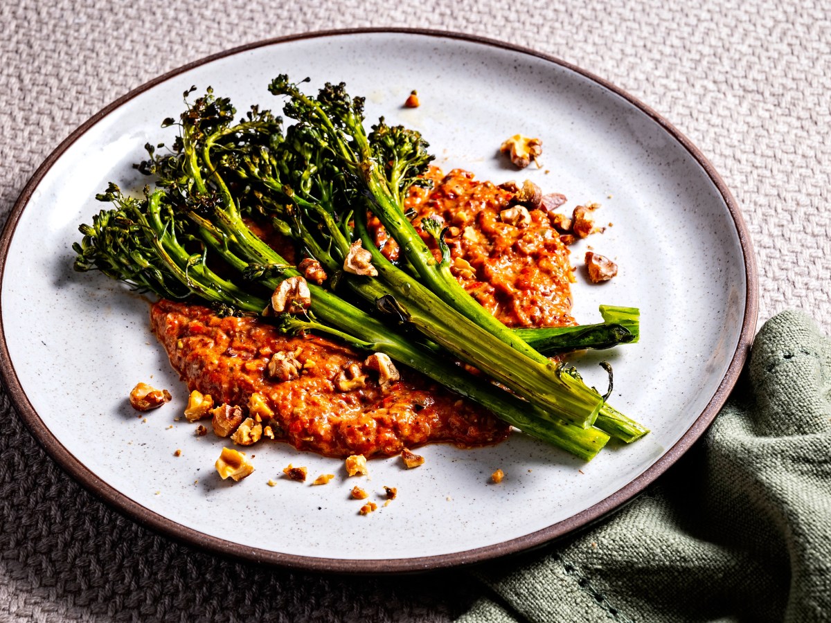 Roasted broccolini served atop a roasted bell pepper puree is brimming with healthful flavors.