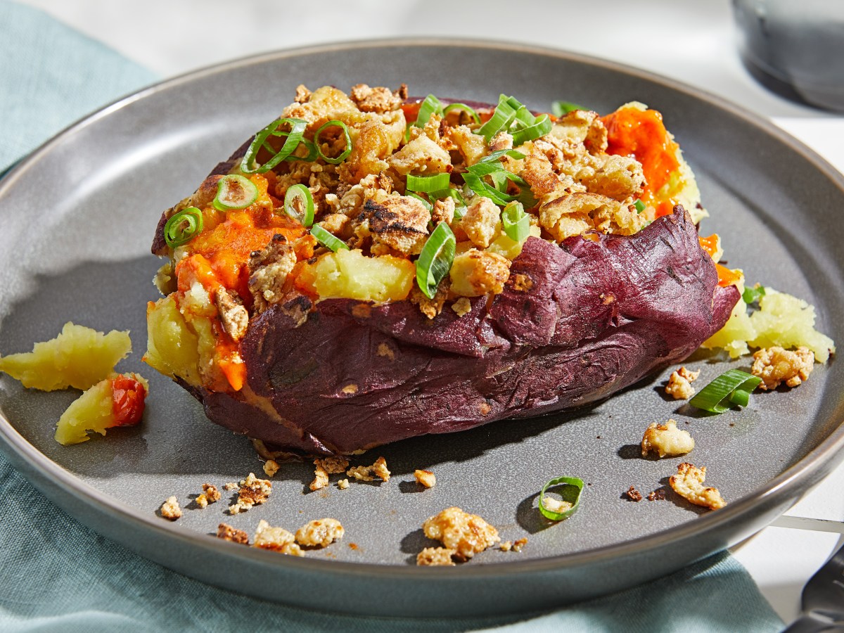 Topped with tofu and gochujang butter, the potatoes make a fun, satisfying meal.