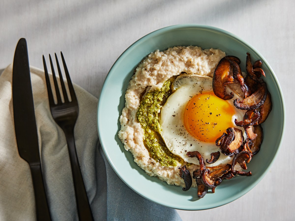 Shake up breakfast with savory oatmeal with eggs and pesto