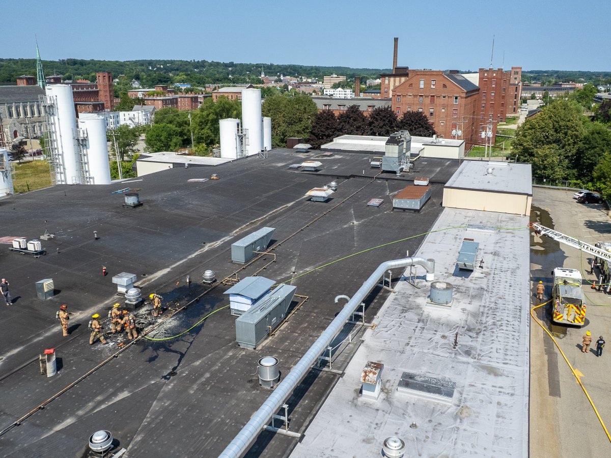 An aerial view of firefighters on the roof of the Lewiston bakery Saturday morning.