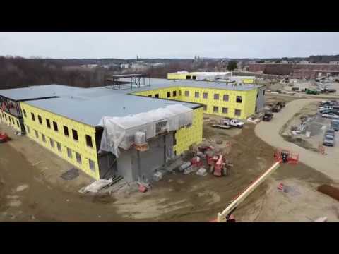 Construction workers look like ants on the roof of the Connors Elementary School under construction on the grounds of Lewiston High School on Tuesday afternoon. (Russ Dillingham/Sun Journal)