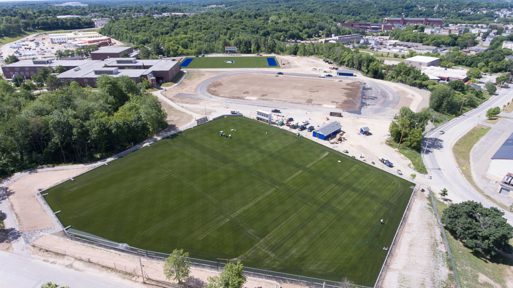 Lewiston High School’s new baseball field, foreground, and its brick backstop are taking shape, as are the multi-use track and football field, background. At top left, the new Connors Elementary Schoool’s exterior is nearly complete. Visit sunjournal.com to watch the monthly aerial flyover of the project. (Russ Dillingham/Sun Journal)
