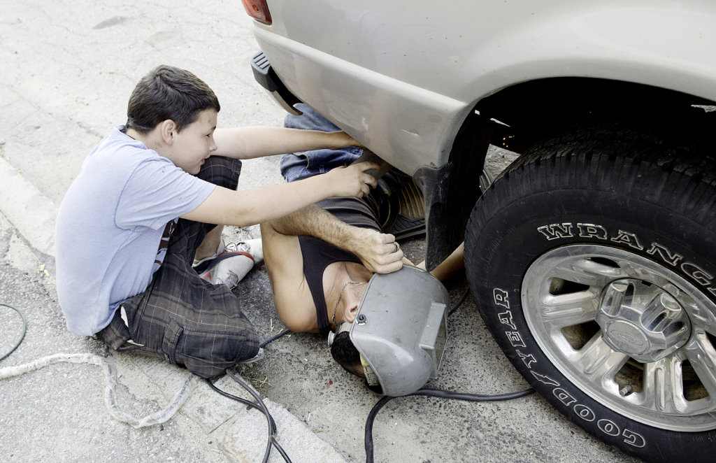 Manuel Levesque, 12, helps his father, Shannon Levesque, repair the tailpipe to their truck Sunday morning in downtown Lewiston. “I’m not a welder, but it will have to do,” Shannon Levesque said. (Daryn Slover/Sun Journal)