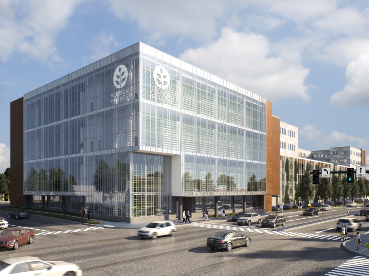 The new development, consisting of a parking garage, apartments and a four-story urban hydroponic farm, is under construction downtown.