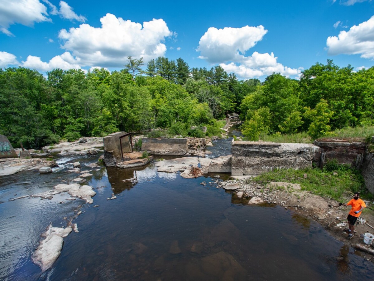Lisbon man uses magnet to fish for metal in the Sabattus River Wednesday afternoon.