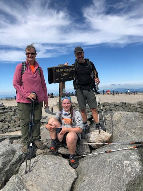 Abby Washburn, seated, at the summit of Mount Wasington in New Hampshire with her mother, Amy, left, and fellow thru-hiker Dave Gorby.